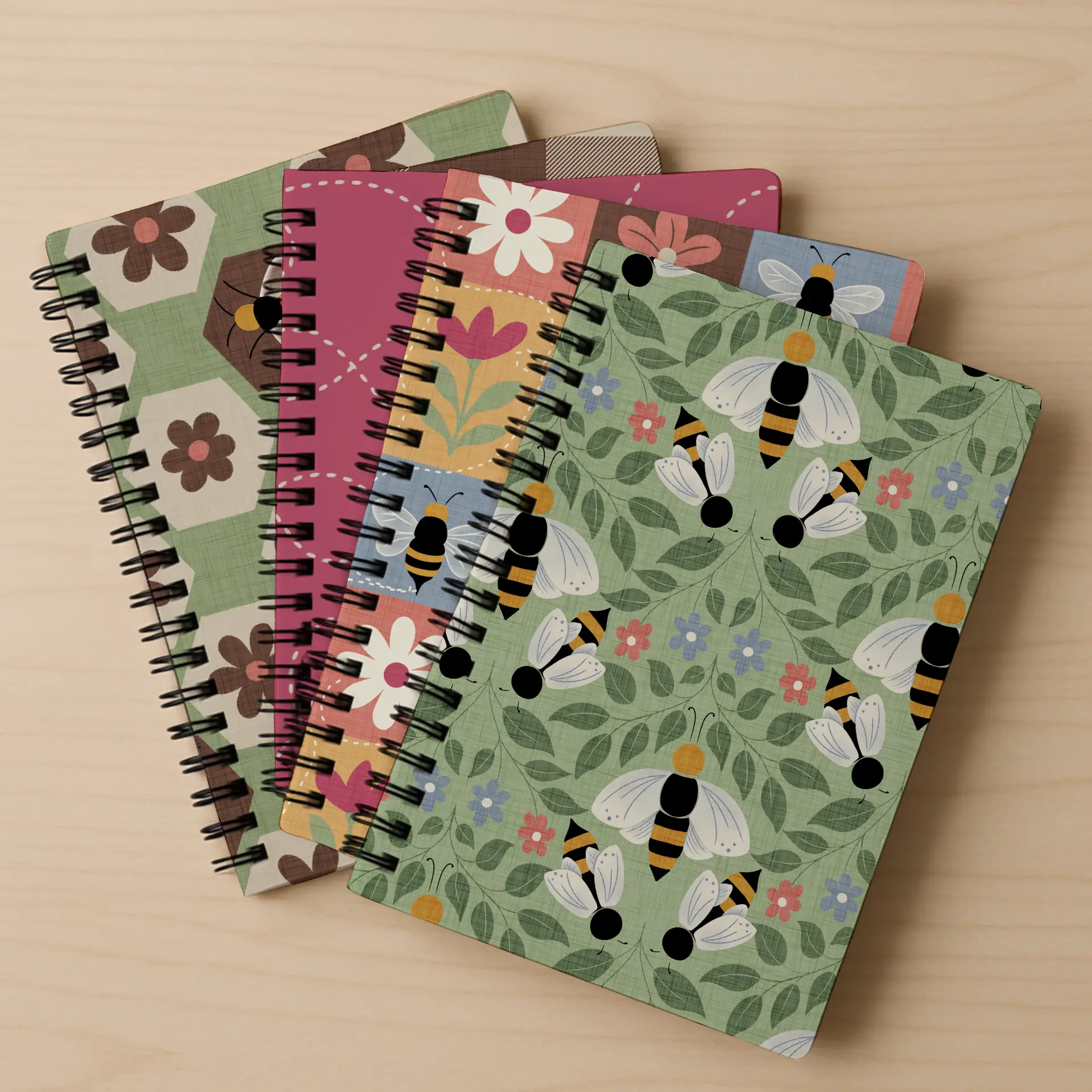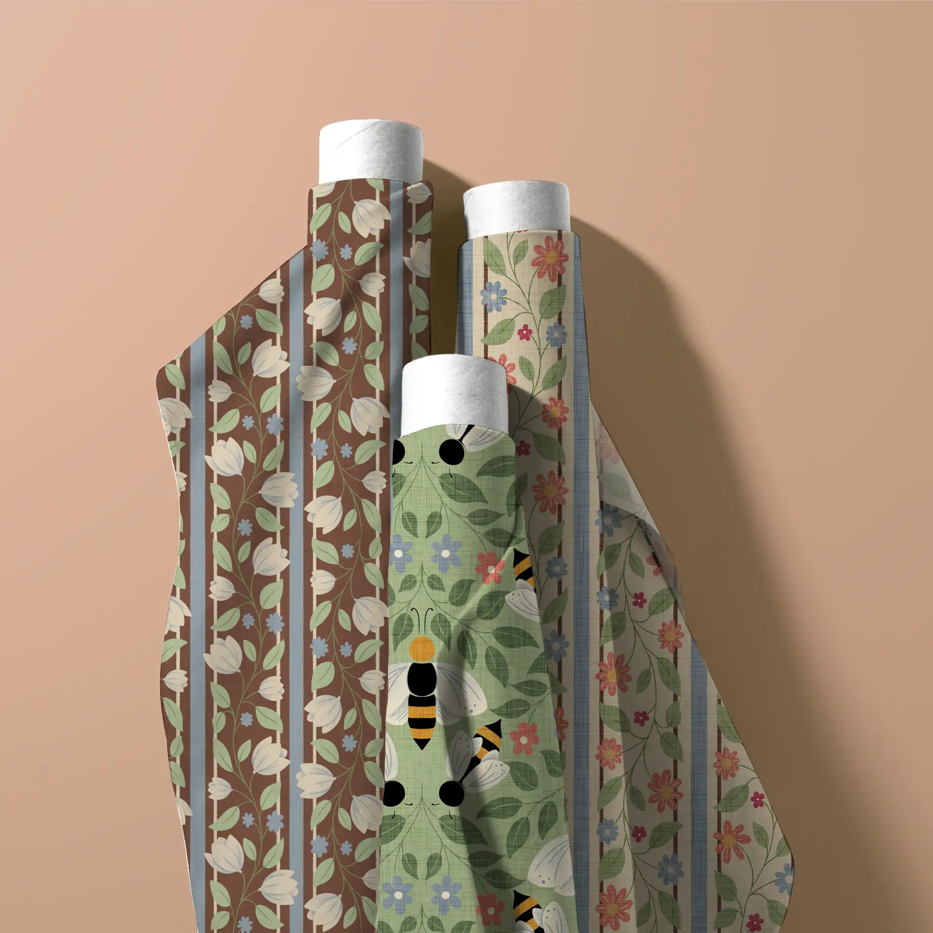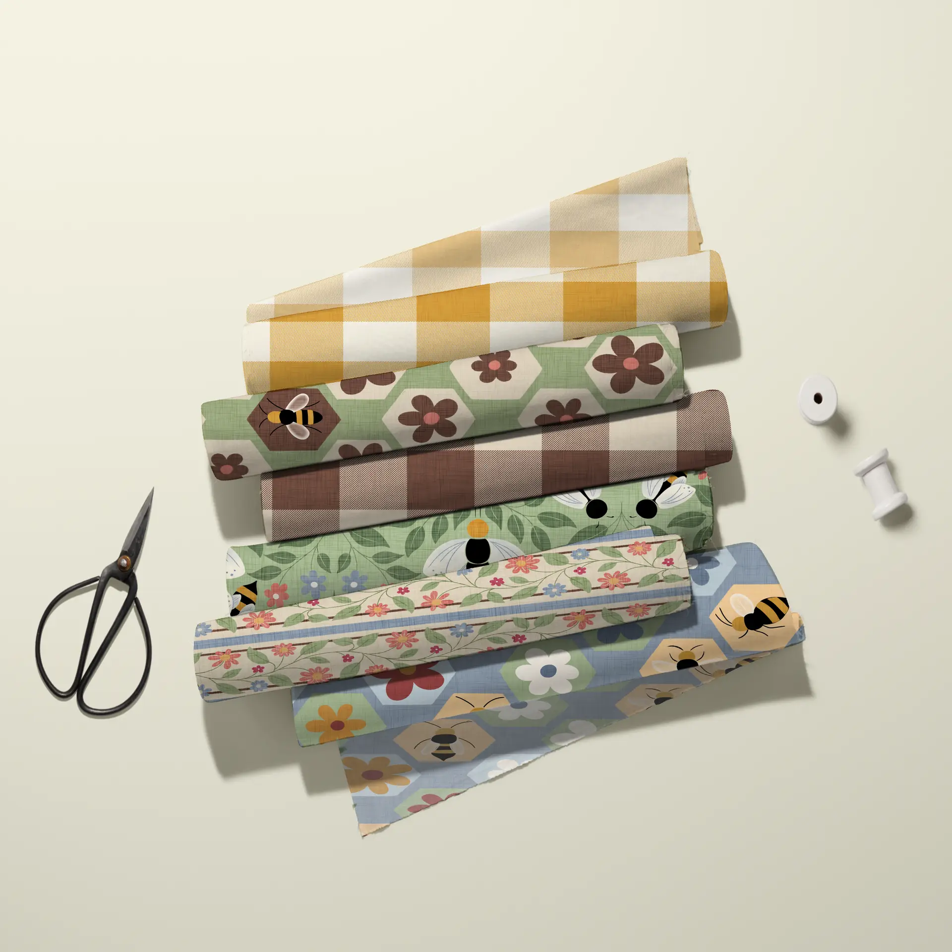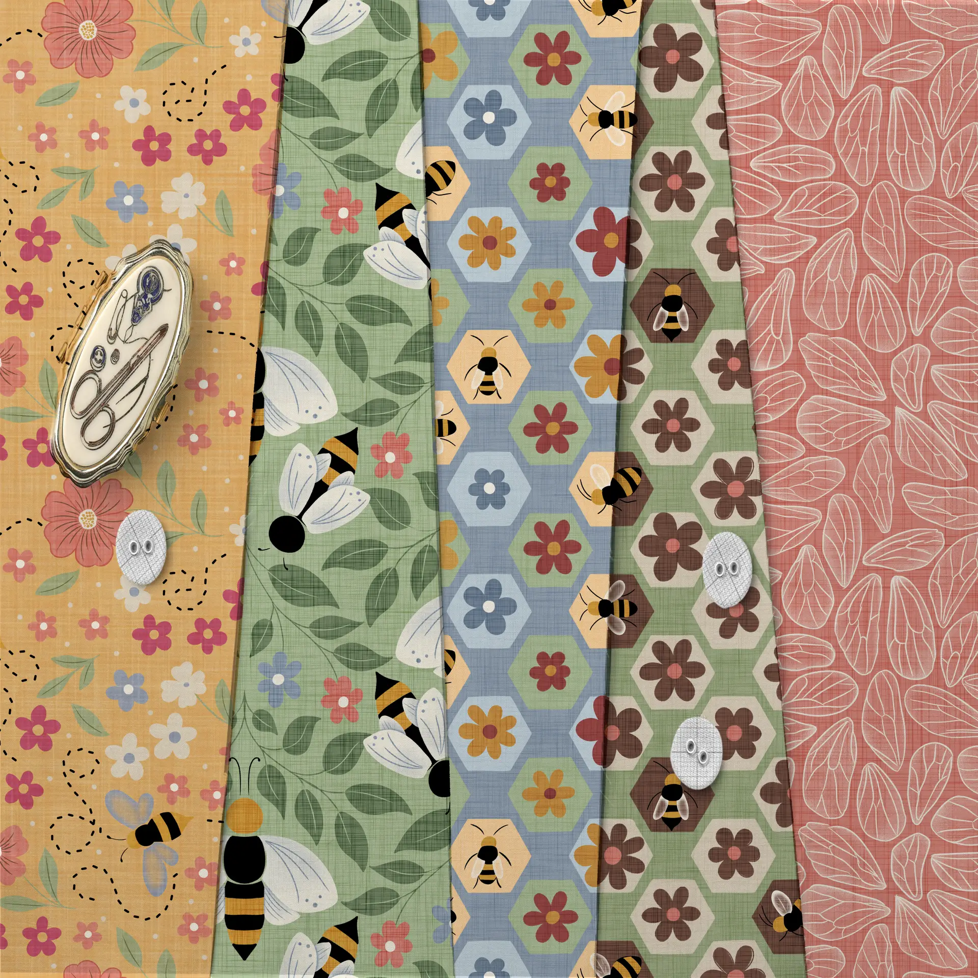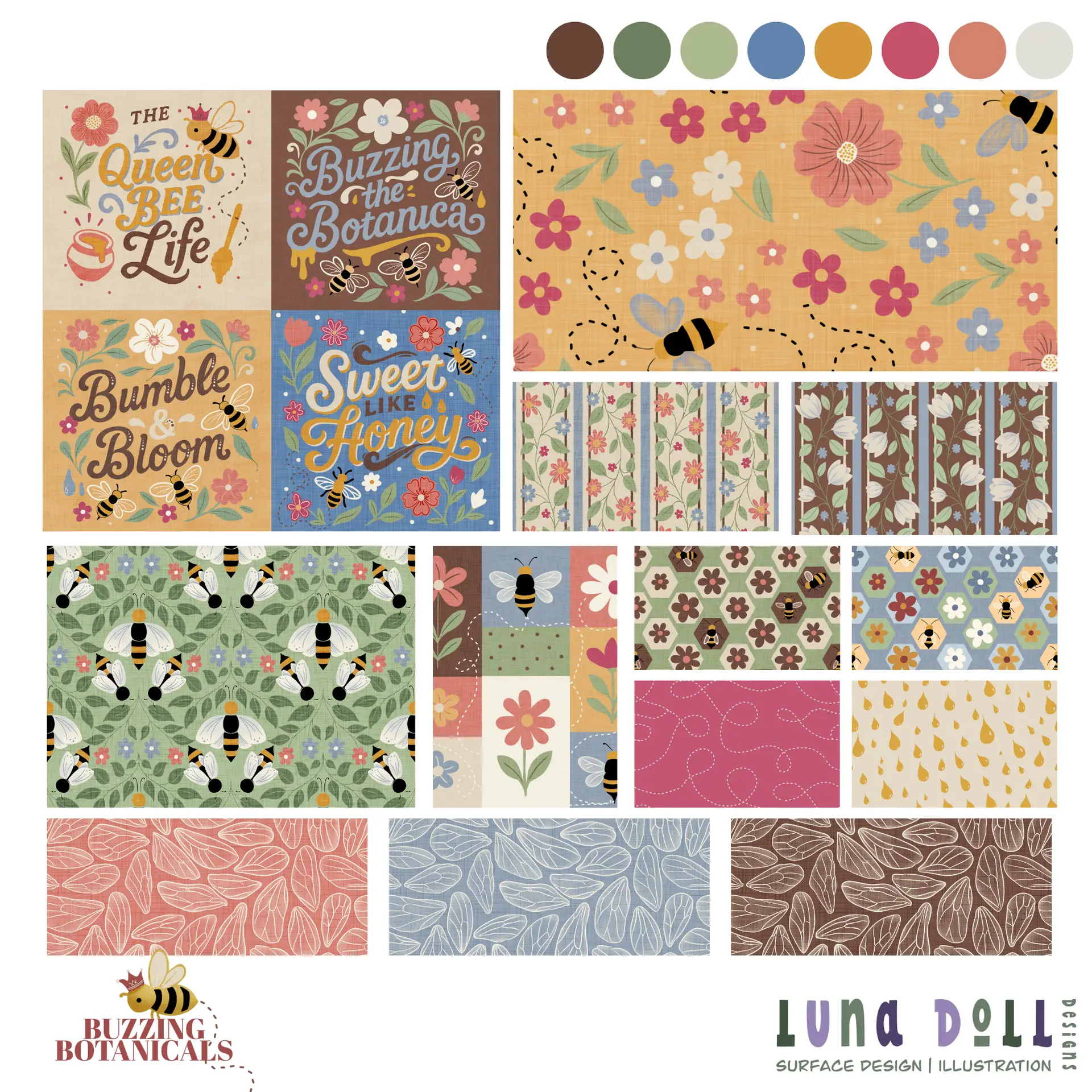 Buzzing Botanicals is a cheerful, garden-inspired collection celebrating bees, blooms, and the whimsy of springtime. A warm, earthy palette of honey gold, clay brown, sage green, dusty blue, soft coral, and blush pink creates a cozy, vintage-floral aesthetic with broad commercial appeal.